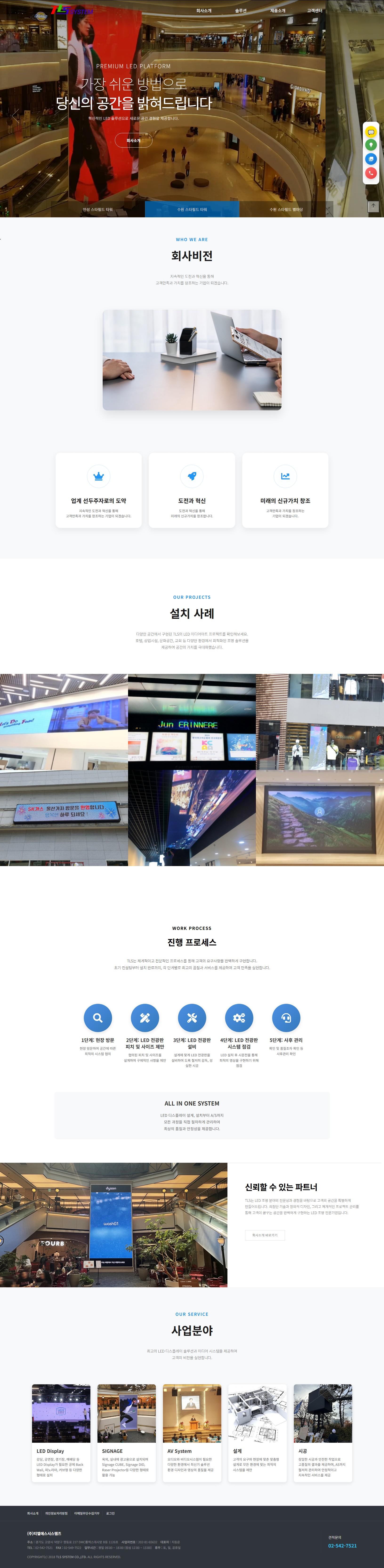 기업 홈페이지 중에서 디자인적으로 레이아웃적으로 매우 고객이 만족한 홈페이지 입니다. 기존에 홈페이지가 있었지만 스타필드, 세종문화회관등 큰 공간에 대형 LED 를 설치한 업체로써 영상을 주로 사용해서 만들어진 홈페이지 입니다. 요즘 트랜드에도 잘 맞고 고급스럽고 아름답게 기업을 잘 표현했다고 생각합니다.