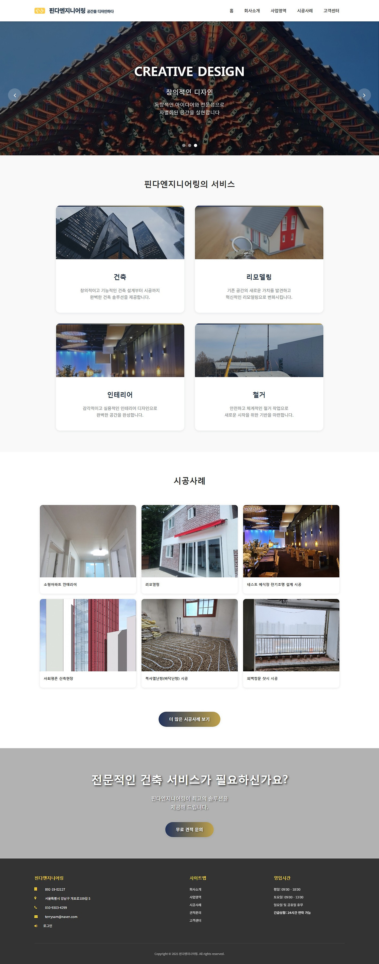 핀다엔지니어링의 홈페이지는 현대적이고 세련된 디자인을 특징으로 합니다. 홈페이지의 상단에는 "Creative Design"이라는 문구와 함께 건축 세부 사항의 인상적인 이미지가 배치되어 있습니다. 이러한 디자인은 방문자에게 강한 인상을 남기며, 전문성을 강조합니다.